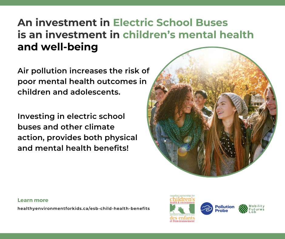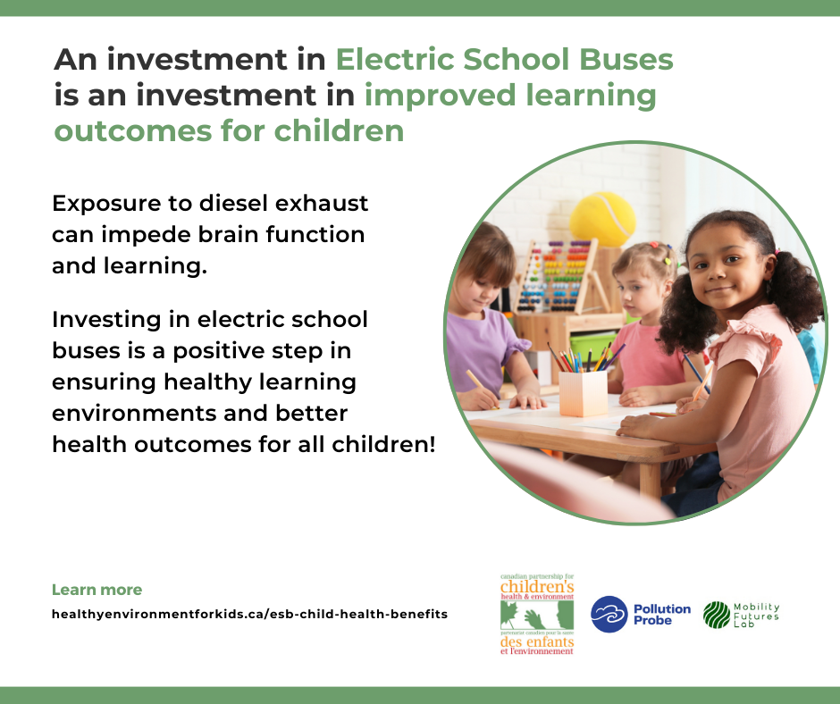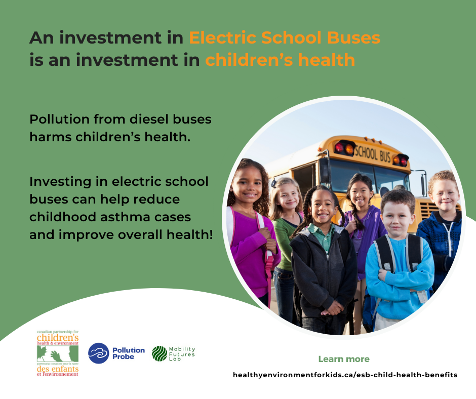 To accelerate this shift and to strengthen partners’ advocacy efforts, the Canadian Partnership for Children’s Health and Environment (CPCHE), in partnership with Pollution Probe and Mobility Futures Lab created this “Child Health Benefits of Investing in Electric School Buses” messaging kit.