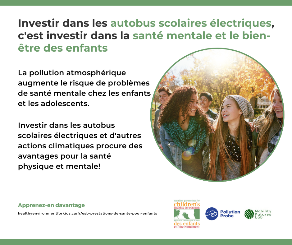 Afin d’accélérer cette transition et de renforcer les efforts de plaidoyer des partenaires, le Partenariat canadien pour la santé des enfants et l’environnement (CPCHE), en collaboration avec Pollution Probe et le Mobility Futures Lab, a créé cette trousse de messages intitulée « Les bienfaits pour la santé des enfants de l’investissement dans les autobus scolaires électriques ».
